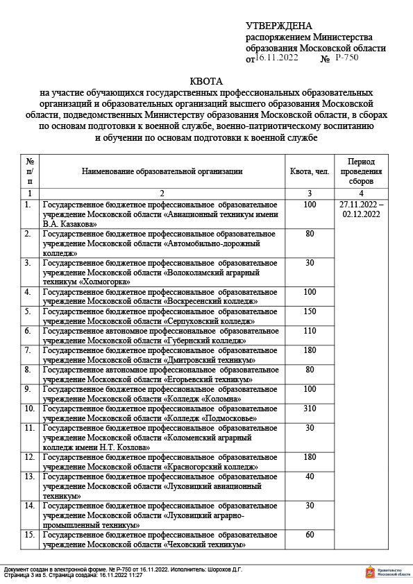 Распоряжение Минобразования Московской области о сборах было подписано 16 ноября. Согласно документу, колледжи и вузы должны отправить на сборы начальной военной подготовки от 30 до 450 совершеннолетних студентов, квота указана на каждое учреждение.