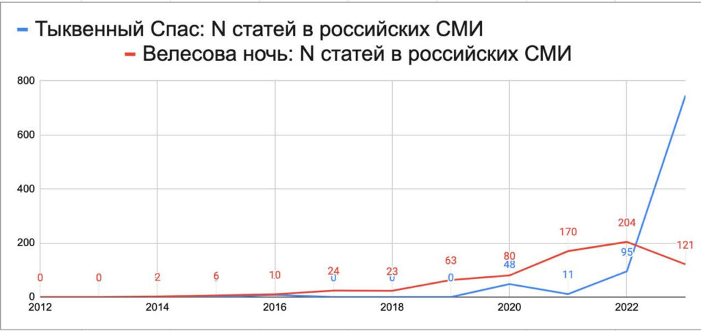 Забегая вперед, скажу: оба этих праздника совершенно фантомны, но количество их упоминаний в российских СМИ растет с каждым годом. В 2023-м про «настоящие славянские праздники», которые следует отмечать вместо Хеллоуина в ночь на 1 ноября, написали 867 изданий, а 10 лет назад, в 2013-м, — ноль.