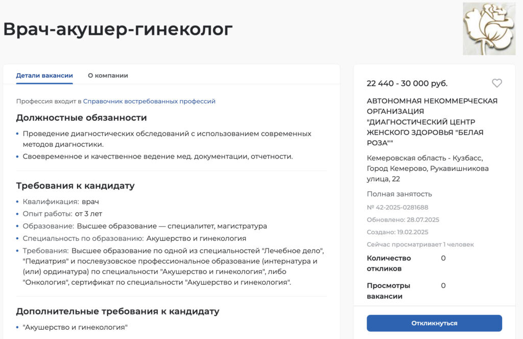 Путаница отражается и в вакансиях, которые проанализировала «Гласная». Например, в Кемеровской области средняя зарплата акушера-гинеколога — 60 тысяч рублей. Однако есть больницы, которые предлагают зарплаты с вилкой, которая начинается с МРОТ — 22 440 рублей в месяц.